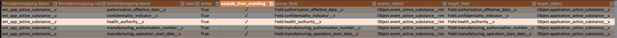 The Rimfieldmapping component tab includes the exclude_from_matching column. Generally, a checkmark in this column means that the mapping is not used to match fields between objects when Vault is already performing a similar check within another process. In most cases, Vault ignores such mappings as applicable within the Create Related Records wizard and Global Content Plan dispatch features.