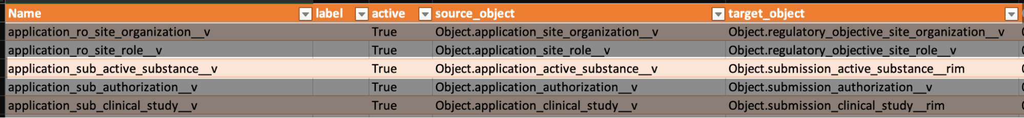 Each mapping is prefixed with the object relationship, followed by the related record Vault is attempting to find using this mapping. For example, the application_sub_active_substance__v object mapping locates shared Active Substances within Application and Submission relationships, based on the fields defined within the report’s source_object and target_object columns. In this example, these values allow Vault to match the Application’s active_substance__v field to the Submission’s active_substance__rim field.
