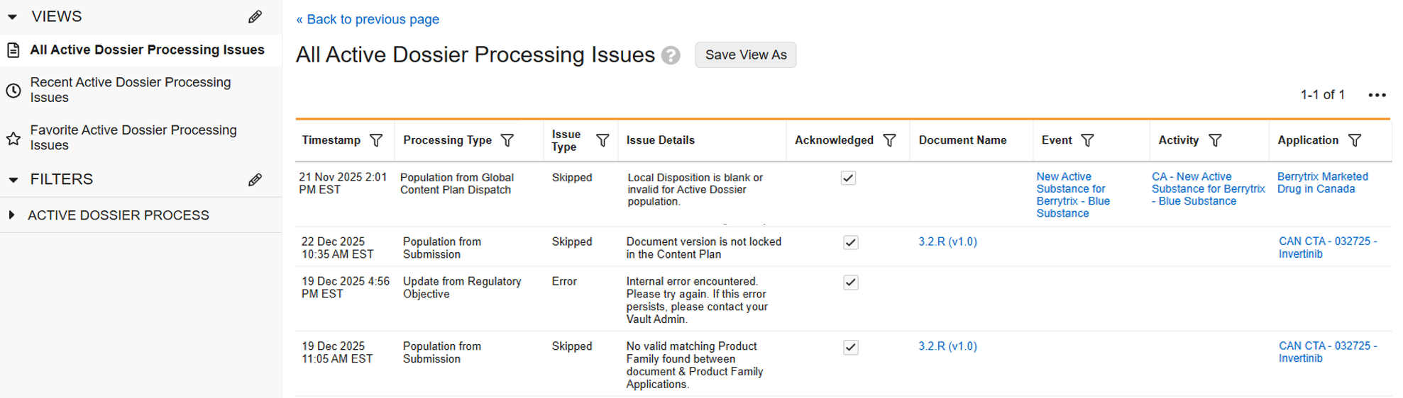 When Active Dossier records are not created or updated as expected, the Processing Issues page provides detailed visibility into failed, warned, or intentionally skipped records.