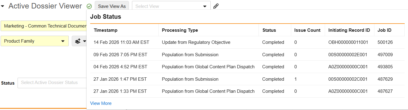 Users can hover over the Processing Status indicator to view a hovercard displaying the five most recent Active Dossier processing records. Selecting View More opens a dedicated tab displaying all Active Dossier Processing records for the relevant hierarchy.