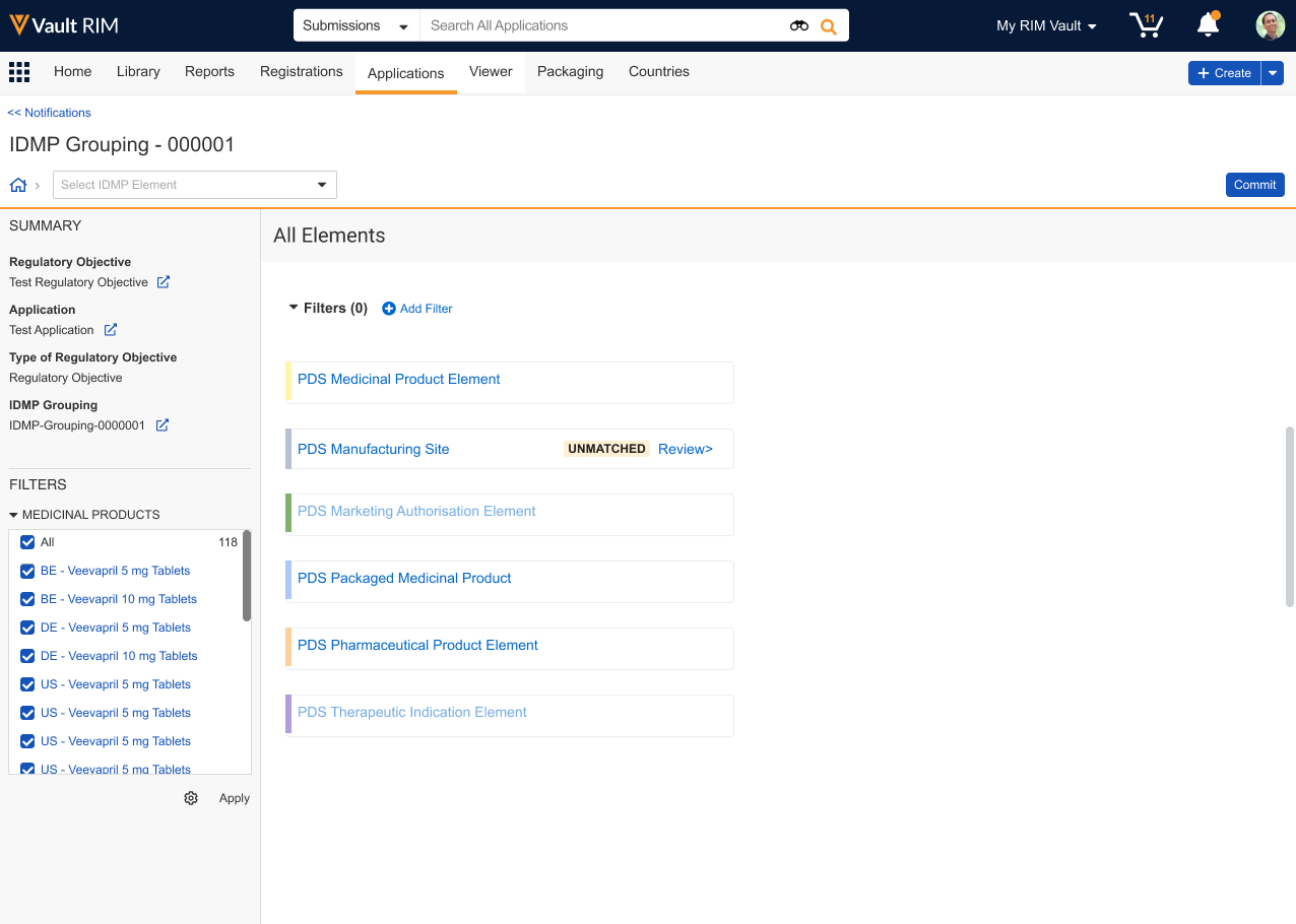 Once Vault initiates an IDMP Viewer session, the Data View Owner can begin reviewing the selected records across one or multiple sessions. When the view includes Unmatched data, click Review> to do so directly. Otherwise, apply any Filters to locate the element you’d like to review, then click Commit.