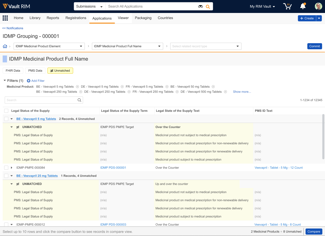 When the IDMP Viewer flags PMS or FHIR message data as Unmatched, this means that the data exists in PMS but does not exist in RIM, or PMS data does not match existing RIM data based on defining characteristics. The viewer’s various filters can help you determine which is correct.