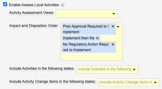 Impact and Disposition Order controls the order in which Vault determines the priority order of the assessment, based on the Local Disposition picklist values. The first item will be considered the most restrictive. We recommend using the default values and ordering (Prior Approval Required to Implement, Implement then file, then No Regulatory Action Required to Implement) however you can add, remove, or re-order the default values as required. This controls a validation check with which Vault ensures the local disposition does not have a lower value than the individual impact fields.